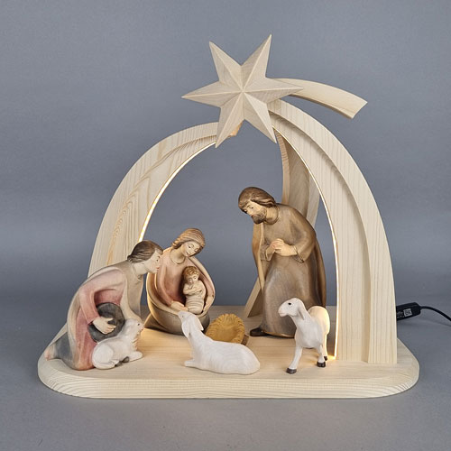 Beim diesjährigen Messebesuch der Christmasworld fiel uns beim Besuch des Standes der Firma ULPE WOOD ART® schon aus einiger Entfernung der wunderschöne, bogenförmige Krippenstall mit dem Morgenstern auf, der zudem mit einer außergewöhnlichen Beleuchtung auf sich aufmerksam machte. Der Stall war mit farbigen Figuren der Rowi Krippe bestückt.